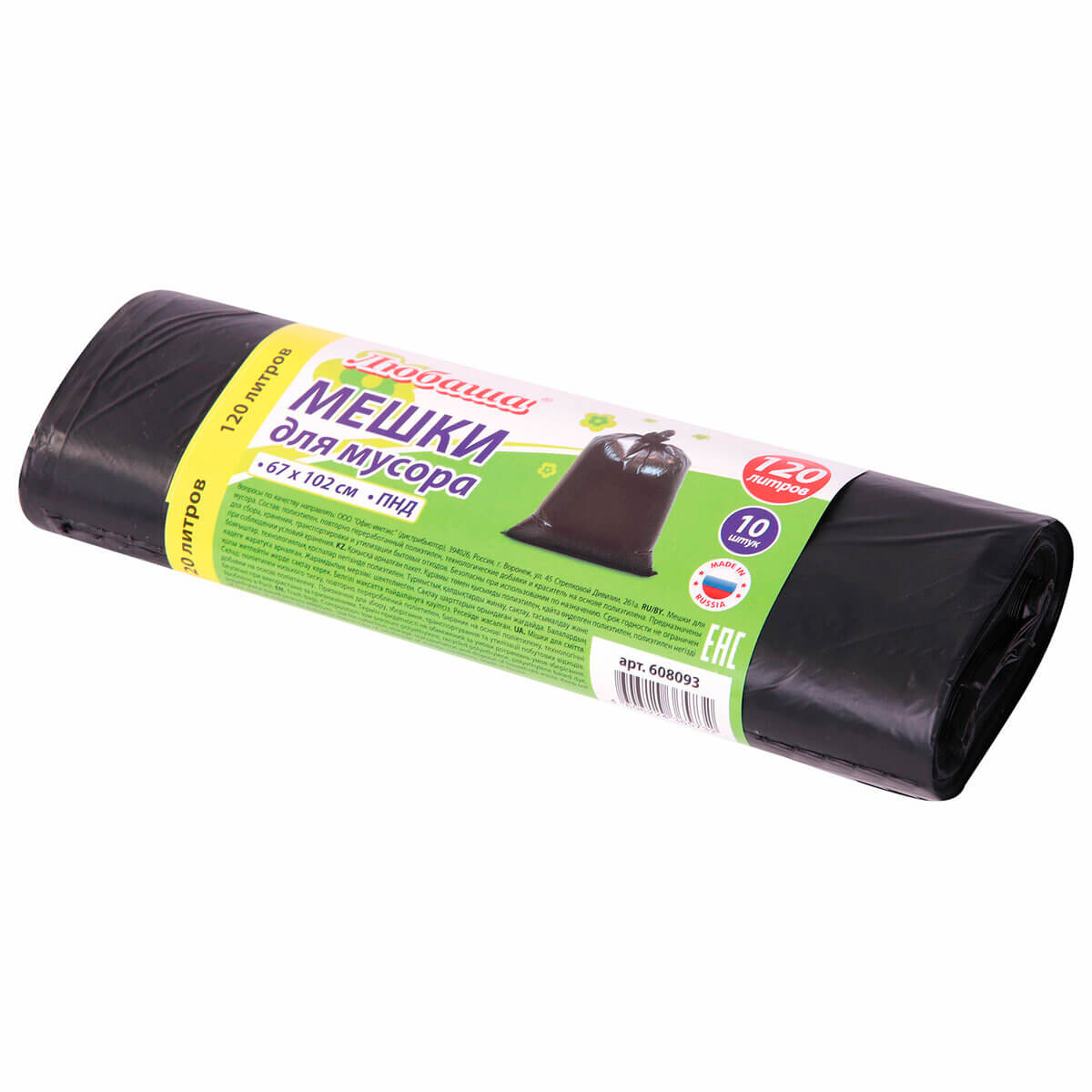 Мешки для мусора 120 л, черные, в рулоне 10 шт., ПНД, 11 мкм, 1020х670 мм, Любаша, 608093