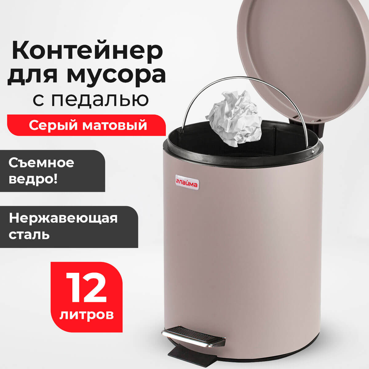 Ведро-контейнер для мусора (урна) с педалью LAIMA Classic, 12 л, серое, матовое, металл, со съемным внутренним ведром